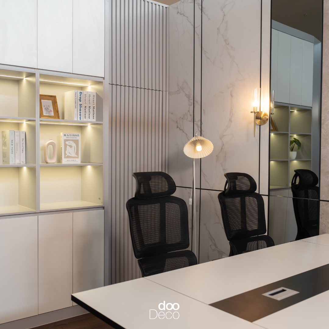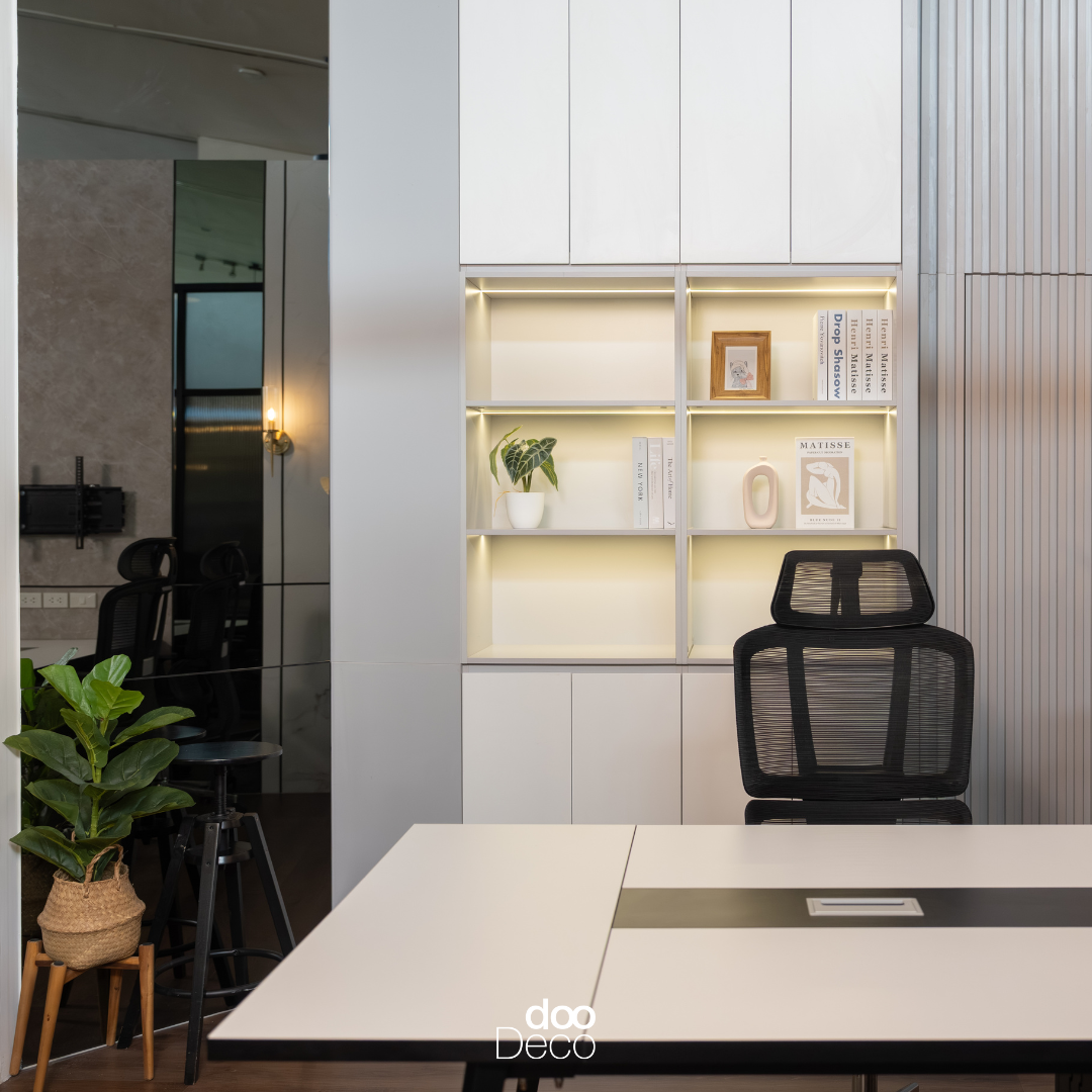 ขยับมาที่โซนห้องประชุม ที่ออกแบบตกแต่งภานในสไตล์ Modern Luxury Meeting Room ลบภาพห้องประชุมน่าเบื่อไปได้เลย เพราะที่นี่ใช้ผนังลายหินอ่อนสีขาวและกระจกเงาช่วยให้ห้องดูสว่าง นั่งคิดงานได้ไอเดียพุ่งกระฉูด แถมมีตู้เก็บเอกสารบิ้วอิน-ฟิตอินที่เก็บความวุ่นวายของเอกสารได้เรียบกริบแต่จุใจ