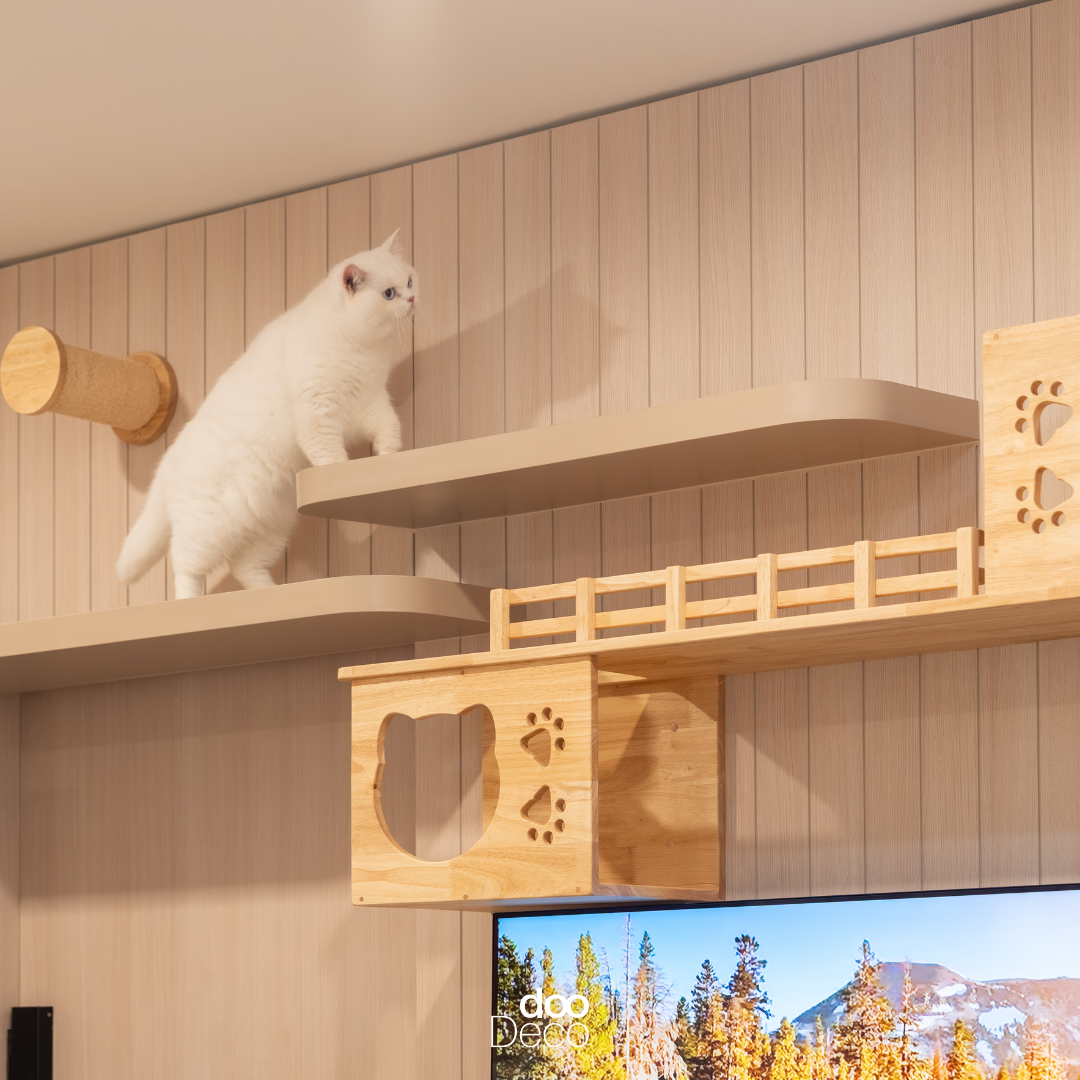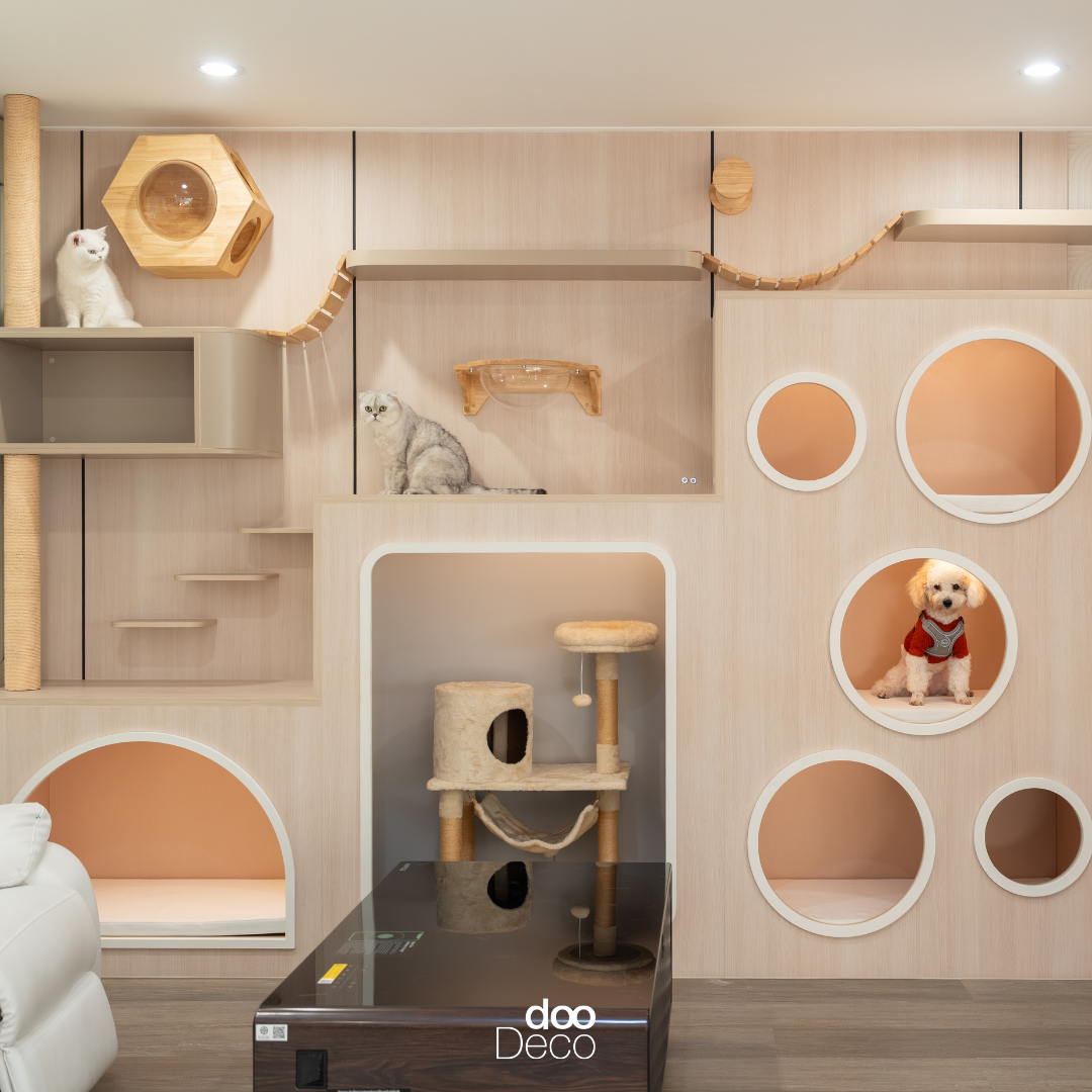 ก้าวแรกที่เดินเข้ามาจะเจอกับโซนที่ทำให้ต้องอมยิ้ม คือห้องนั่งเล่นแบบ Pet-Friendly ที่กว้างขวางเป็นพิเศษ ไฮไลท์ที่ห้ามพลาดคือมุมบิ้วอิน-ฟิตอินที่ทำเป็นสเต็ปสำหรับน้องแมวให้ได้ปีนป้ายเล่นซน และพื้นที่บ้านสุดคิวท์ให้น้องหมาได้นอนพักผ่อนแบบส่วนตัว