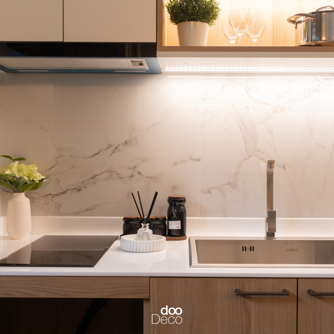The Perfect Kitchen โซนห้องครัวคือที่สุดของความหรูหรา นำเสนอความเป็น Modern Luxury อย่างเต็มรูปแบบผ่านหน้าบานตู้ดีไซน์พรีเมียมและท็อปผนังหินอ่อนที่ดูภูมิฐาน เป็นครัวที่สวย สะอาดตา และใช้พื้นที่ได้คุ้มค่าด้วยการบิ้วอิน-ฟิตอินตู้เก็บจาน ถึงแม้จะสูง แต่เพียงลงมาก็ทำให้ทุกตารางนิ้วสวยและใช้งานได้อย่างลงตัวจนอยากลุกมาทำอาหารทุกวัน