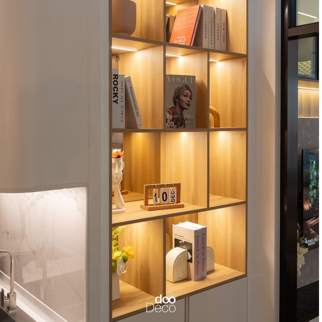 เดินถัดมาอีกนิดจะเจอกับมุมที่ดูนิ่งแต่เท่มาก กับการตกแต่งภายในห้องนั่งเล่นในสไตล์ Dark Modern Luxury ที่ใช้ระแนงไม้โทนเข้มตัดกับผนังหินอ่อน เพิ่มความหรูหราด้วยการซ่อนไฟ LED ให้ฟีลพรีเมียม มาพร้อมตู้บิ้วอิน-ฟิตอินที่ช่วยเพิ่มมิติและเสน่ห์ให้ห้องนั่งเล่นดูน่าค้นหาจนต้องหยุดนั่งดู