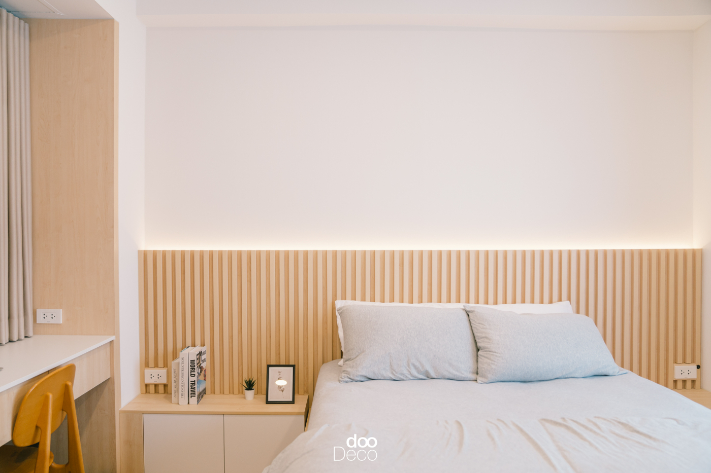 ให้ความรู้สึกเรียบง่ายและประหยัดพื้นที่ในห้องนอนมินิมอลมากขึ้น เพียงปรับจากการใช้หัวเตียงมาตกแต่งด้วยผนังไม้ฉลุสีอ่อนเพื่อเพิ่มมิติให้คล้ายหัวเตียง ทำให้ห้องดูไม่เรียบจนเกินไป ส่วนด้านข้างเตียงบิ้วอินโต๊ะทำงานสีขาวเล็ก ๆ และจัดวางตู้เก็บของขนาดเล็กจัดเก็บสิ่งของต่าง ๆ การออกแบบห้องสไตล์นี้เหมาะกับคนที่ชอบความเรียบง่ายในพื้นที่พักผ่อน