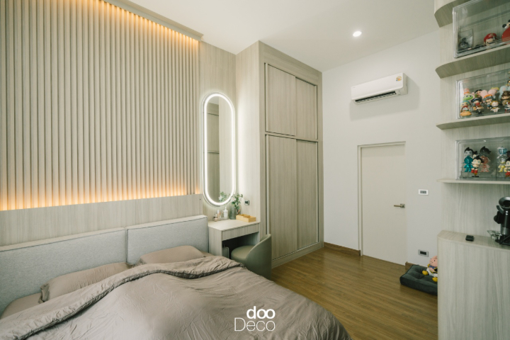 แต่งห้องนอนโทนสีขาว Cloud Dancer ให้อบอุ่น ด้วยหัวเตียงดีไซน์ระแนงไม้แบบเต็มผนัง ทำให้ห้องดูมีมิติมากขึ้น พร้อมบิ้วอิน-ฟิตอินตู้เสื้อผ้าประตูบานเลื่อนสูงถึงเพดาน ช่วยประหยัดพื้นที่ จัดมุมโต๊ะเครื่องแป้งขนาดเล็กที่มีลิ้นชักเก็บของ และกระจก Smart Mirror ทรงรีขนาดใหญ่ติดไฟ LED เพิ่มความเรียบหรูให้ห้องนอนสีขาวสไตล์มูจิ