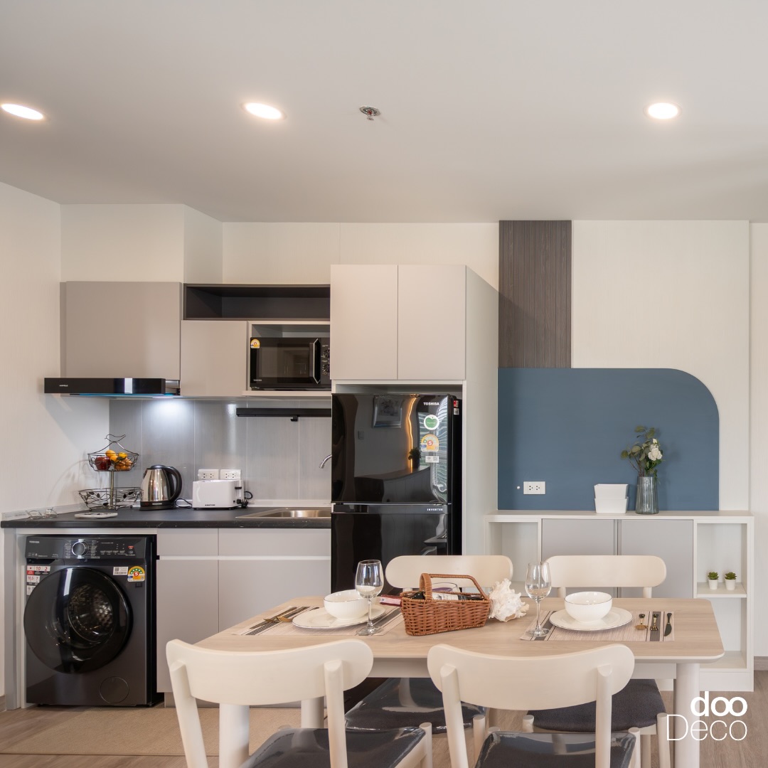 แต่งห้องครัวโทนสีขาว Cloud Dancer ด้วยบิ้วอิน-ฟิตอินเคาน์เตอร์ครัวรูปตัว I สไตล์โมเดิร์นมินิมอล ออกแบบช่องสำหรับวางไมโครเวฟ เครื่องซักผ้า และตู้เย็นได้พอดี เชื่อมต่อกับชั้นวางของสีขาวด้านข้าง เพิ่มลูกเล่นของสีสันผ่านแผงผนังสีน้ำเงินที่ช่วยเสริมมิติให้โดดเด่น ตกแต่งเพิ่มเติมด้วยต้นไม้ และมุมรับประทานอาหารที่เลือกใช้โต๊ะไม้ ให้ภาพรวมของห้องดูอบอุ่นเป็นธรรมชาติ