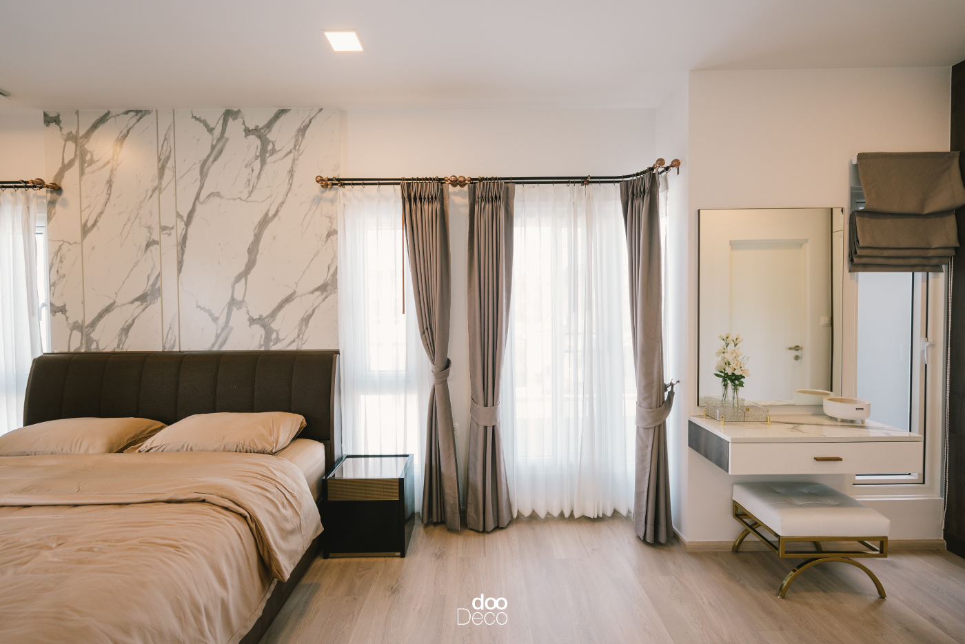 ผลงานแต่งห้องนอนโทนสี Cloud Dancer ให้สวยงามไม่มีตกยุค ใช้ผนังหัวเตียงสีขาวลายหินอ่อนขนาดใหญ่ เป็นตัวเชื่อมกับราวผ้าม่านสไตล์วินเทจ พร้อมมุมโต๊ะเครื่องแป้งขนาดกะทัดรัด ที่มีลิ้นชักลอยตัว ติดกระจกบานสี่เหลี่ยมผืนผ้า และเก้าอี้ดีไซน์ร่วมสมัย เติมเต็มภาพลักษณ์ที่เรียบหรู