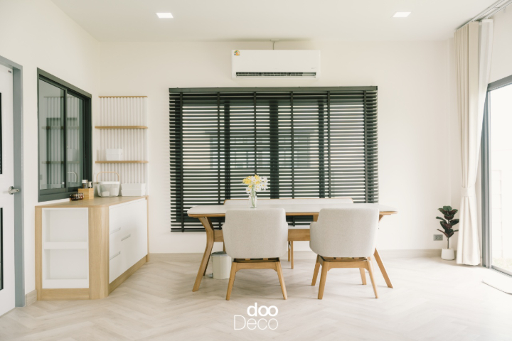 แต่งห้องรับประทานอาหารโทนสีขาว Cloud Dancer ด้วยชุดโต๊ะรับประทานอาหารทรงยาวสไตล์มูจิ บิ้วอิน-ฟิตอินเคาน์เตอร์บาร์ขอบไม้มุมโค้งมน และดีไซน์ผนังระแนงสีขาวพร้อมชั้นไม้สำหรับวางของตกแต่ง เสริมบรรยากาศอบอุ่นด้วยพื้นไม้ลายก้างปลา และหน้าต่างบานใหญ่ที่เปิดรับแสงธรรมชาติ