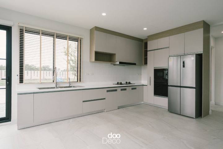 แต่งโทนสี Cloud Dancer ในห้องครัวที่มีพื้นที่กว้างขวาง บิ้วอิน-ฟิตอินเคาน์เตอร์รูปตัว L สีขาว เน้นดีไซน์บานปิดแบบเรียบ ลงตัวกับฟังก์ชันทั้งมุมทำอาหารและมุมอ่างล้างจาน พร้อมช่องสำหรับวางตู้เย็น และตู้แขวนผนังขอบไม้ ปูพื้นไม้สีเทาอ่อน เข้ากับครัวสไตล์โมเดิร์นที่ทันสมัย