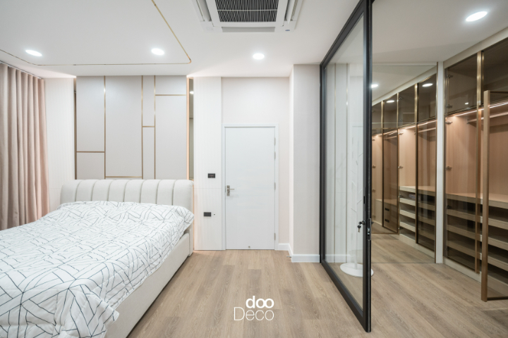 แต่งห้องนอนโทนสีขาว Cloud Dancer ในสไตล์ Modern Luxury ด้วยการใช้เส้นสายสีทองบนผนังหัวเตียง เชื่อมต่อไปยังโซน Walk-in Closet ที่บิ้วอิน-ฟิตอินตู้เสื้อผ้าบานกระจกใสสีชา เพิ่มความหรูหราด้วยไฟซ่อน LED เสริมบรรยากาศให้ห้องดูทันสมัย อยากกลับมาพักใจทุกวัน