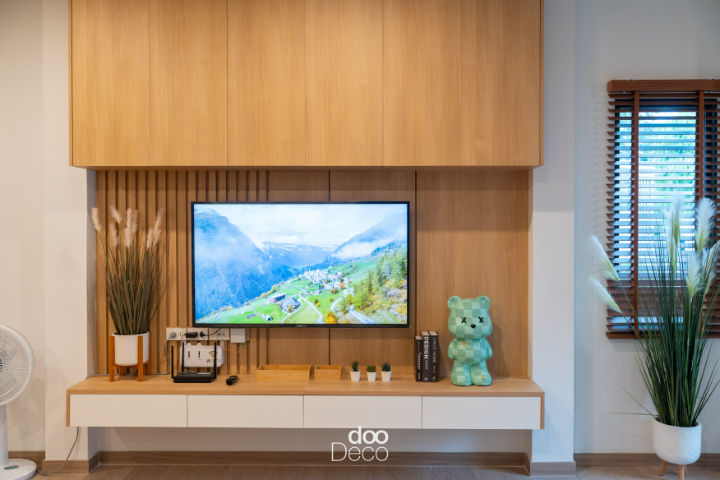 ส่วนตู้ด้านล่างยังคงคุม โทนสีขาว-ไม้แบบเดียวกัน ทำให้ภาพรวมของโซนทีวีเรียบหรู สมดุล และเข้ากันกับบรรยากาศมินิมอลของทั้งบ้าน