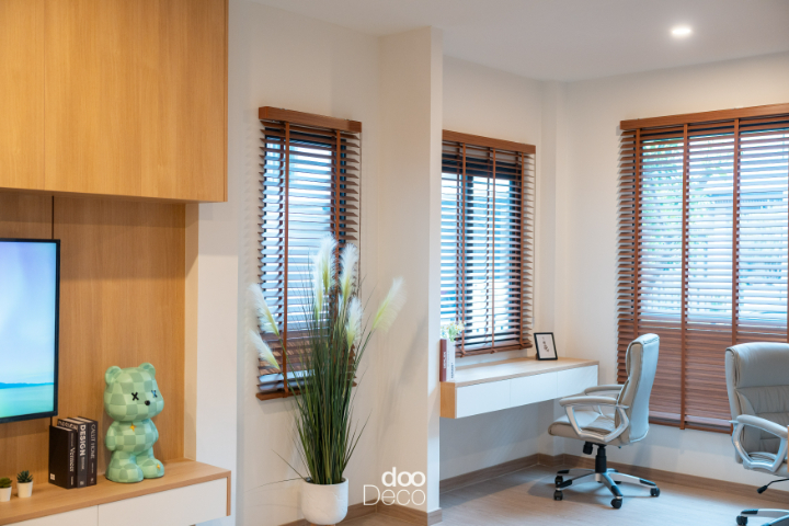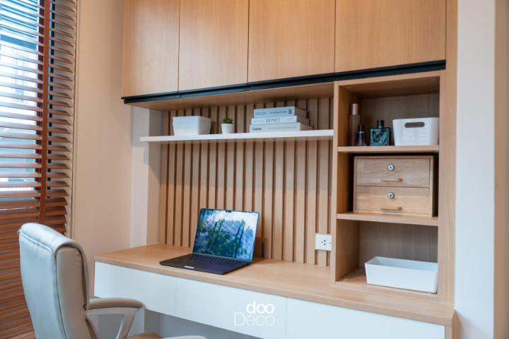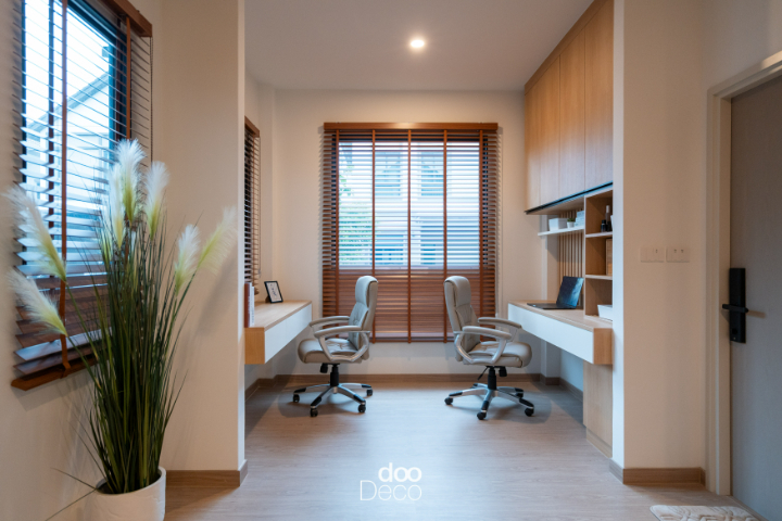 สำหรับห้องทำงานนี้คือพื้นที่ที่ให้ทั้งความสงบและความเป็นระเบียบ ชั้นบิ้วอิน ฟิตอิน ด้านบน และลิ้นชักด้านล่างถูกออกแบบอย่างลงตัว ช่วยจัดเก็บเอกสารหรืออุปกรณ์ต่าง ๆ ได้อย่างเป็นสัดส่วน โต๊ะทำงานรูปแบบเรียบแต่ทันสมัย เชื่อมกับหน้าต่าง ทำให้พื้นที่นี้ได้รับแสงธรรมชาติ ช่วยเพิ่มพลัง ในการทำงานได้ตลอดวัน