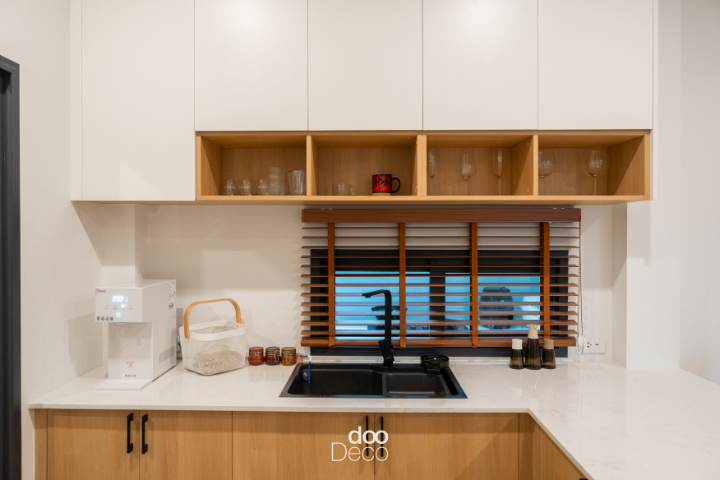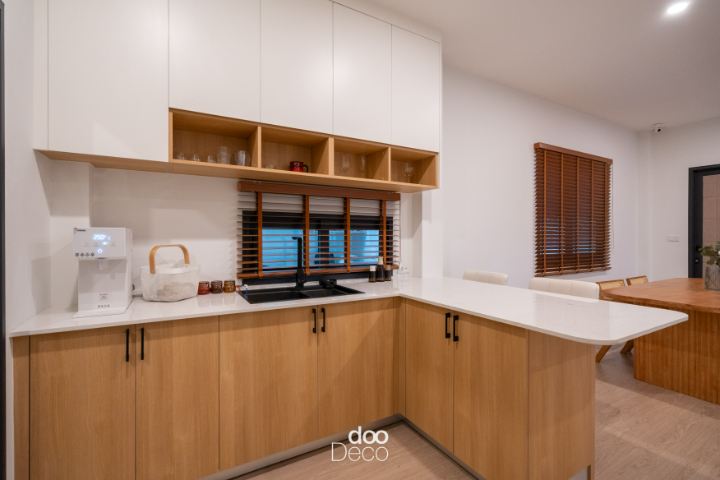 โทนสีกลางของบ้านยังคงถูกใช้ใน ห้องครัว ผ่านงานตู้บิ้วอิน ฟิตอินสีขาวผสมไม้ที่ให้ความรู้สึกสะอาด อบอุ่น และคุมตึมของบ้านได้อย่างยอดเยี่ยม การออกแบบเคาน์เตอร์และตู้เก็บของดีไซน์เรียบช่วยเพิ่มพื้นที่เก็บให้มากขึ้น โดยไม่รบกวนความเป็นระเบียบแบบมินิมอล อีกทั้งยังคำนึงถึงการใช้งานจริง ทำให้ทำอาหารได้สะดวกและเป็นสัดส่วน
