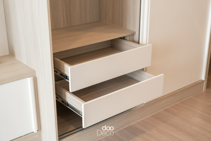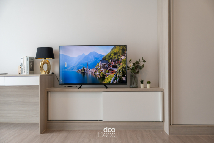 เราเลือกใช้โทนสีที่เป็นมิตรต่อสายตาอย่างสีขาวและงานไม้โทนสว่างเป็นหลัก เพื่อสร้างบรรยากาศที่ดูกว้างขวางและสะอาดตา ซึ่งเป็นหัวใจสำคัญของงานออกแบบจาก dooDeco ที่ต้องการให้ผู้อยู่อาศัยรู้สึกผ่อนคลายทันทีที่ก้าวเข้าห้อง
