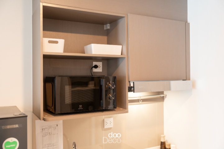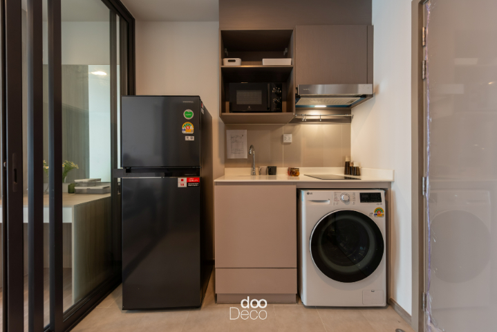 และสิ่งที่น่าสนใจที่สุดคือการพิสูจน์นิยามของ Small Space, Big Solution แม้จะเป็นมุมที่จำกัด แต่เรายังสามารถแทรกมุมโต๊ะเครื่องแป้งที่ตอบรับกับการใช้งานจริงได้อย่างพอเหมาะ รวมถึงการจัดสรรโซนครัวให้เป็นสัดส่วน ทำให้ทุกตารางนิ้วในโครงการนี้กลายเป็นพื้นที่ที่เต็มไปด้วยประสิทธิภาพและสไตล์ที่บ่งบอกความเป็นคุณ