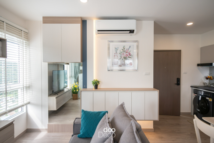 ในทุกโซนของห้องนี้เราจึงใส่ตู้บิ้วอิน-ฟิตอินที่ถูกคิดมาอย่างดีเพื่อให้ห้องดูเป็นระเบียบอยู่เสมอ หากคุณกำลังมองหาไอเดีย ออกแบบตกแต่งภายใน ที่เปลี่ยนห้องสี่เหลี่ยมให้เป็นพื้นที่ที่ทั้งสวยและใช้งานได้จริงแบบนี้ dooDeco พร้อมเป็นเพื่อนคู่คิดให้คุณ