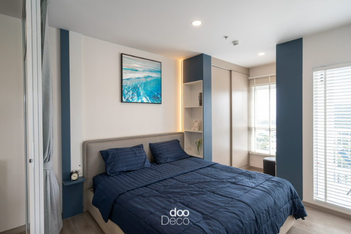 ห้องนี้ถูกดีไซน์ให้มีความ Modern เป็นพื้นฐานเพื่อให้ดูสบายตา แต่ไม่ลืมเพิ่มลูกเล่นที่น่าสนใจด้วย สีฟ้าเข้มอมเขียว (Deep Teal) ซึ่งช่วยดึงบรรยากาศของหัวหินเข้ามาไว้ในห้องได้อย่างมีสไตล์