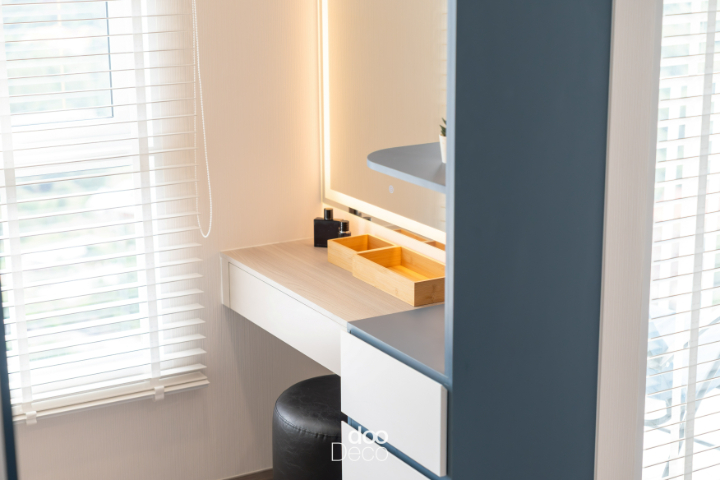ในส่วนของห้องนอน dooDeco เลือกใช้การบิ้วอิน-ฟิตอินตู้เสื้อผ้าแบบสูงจรดฝ้า เพื่อกำจัดปัญหาเรื่องฝุ่นบนหลังตู้และเพิ่มพื้นที่จัดเก็บให้มากที่สุด รวมถึงโต๊ะเครื่องแป้งที่ออกแบบมาได้อย่างเป็นสัดส่วน ลงตัวกับพื้นที่จำกัด ทำให้การเตรียมตัวในตอนเช้าเป็นเรื่องง่าย