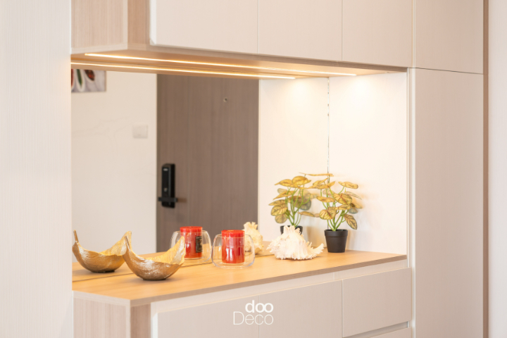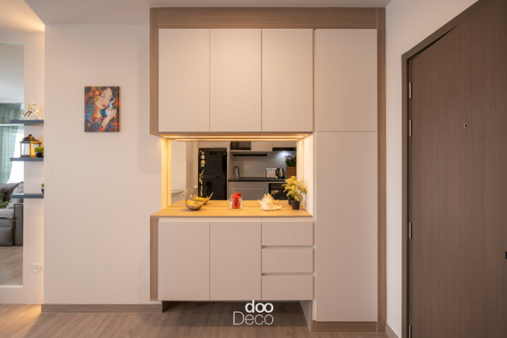 เมื่อเปิดประตูเข้ามา จะพบกับตู้บิ้วอิน-ฟิตอินที่ออกแบบมาเพื่อเก็บรองเท้าและของใช้อย่างเป็นระเบียบ จุดเด่นอยู่ที่การใช้ กระจกเงา ตกแต่งหน้าบาน ซึ่งนอกจากจะใช้เช็ค Outfit ก่อนออกจากห้องแล้ว ยังช่วยสะท้อนแสงให้ห้องดูมีมิติและกว้างขึ้นอย่างลงตัว
