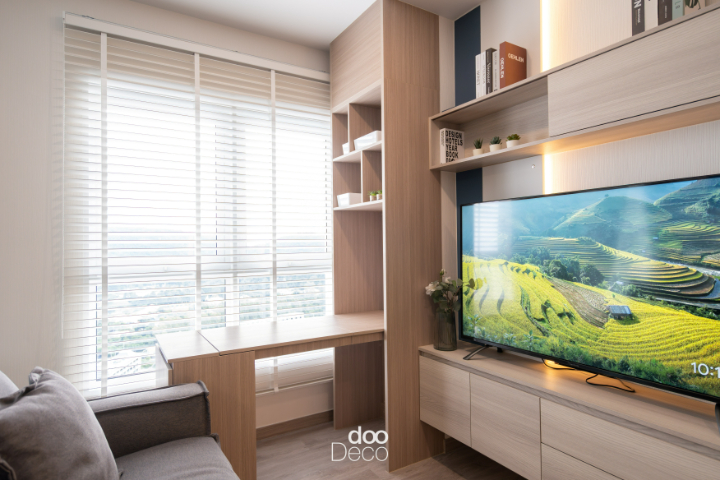 ในโซนพักผ่อน เราเลือกตกแต่งแบบ Minimal Luxury โดยเน้นไปที่การใช้ ไฟซ่อน LED เพื่อเพิ่มความหรูหราและสร้างมิติให้ห้องดูมีระดับในยามค่ำคืน แต่สิ่งที่สำคัญที่สุดในมุมนี้คือ งานบิ้วอิน-ฟิตอินที่ซ่อนโต๊ะพับได้ เอาไว้ข้างใน เมื่อไม่ใช้งานจะเห็นเพียงผนังตู้ที่เรียบ ช่วยให้ลดการใช้พื้นที่และทำให้ห้องดูโปร่งโล่งตลอดเวลาที่ไม่ใช้งาน