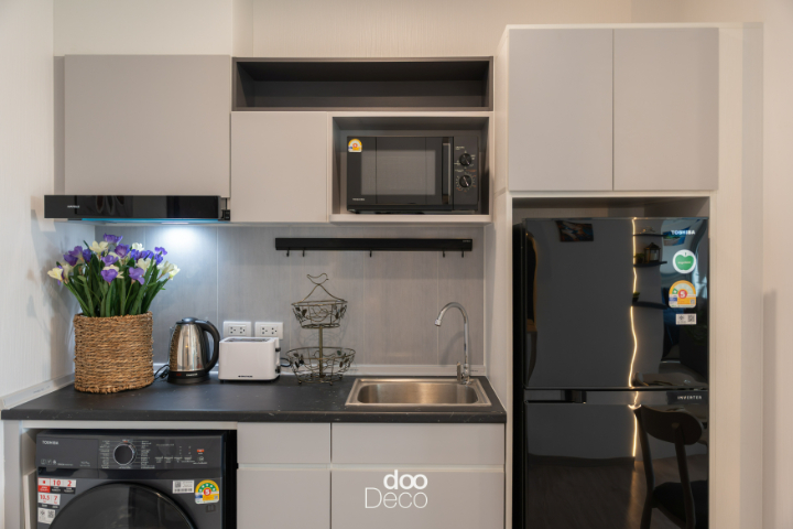 ถัดมาคือโซนห้องครัวถูกดีไซน์ด้วยงานบิ้วอิน-ฟิตอินเข้ามุมที่เป๊ะทุกตารางนิ้ว โดยมีช่องสำหรับวางตู้เย็นและเครื่องซักผ้าฝาหน้าได้อย่างพอดี ช่วยให้พื้นที่ครัวขนาดกะทัดรัดกลายเป็นมุมที่ใช้งานได้อย่างคุ้มค่าและดูเรียบหรูไปพร้อมกัน