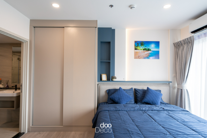 สำหรับห้องนอน จุดเด่นคือ ชั้นบิ้วอิน-ฟิตอินสีฟ้าอมเขียว (Deep Teal) บริเวณหัวเตียง เพื่อดึงกลิ่นอายของท้องทะเลหัวหินเข้ามาสร้างความสดชื่น ส่วนในเรื่องของการจัดเก็บ เราติดตั้งตู้เสื้อผ้าบิ้วอิน-ฟิตอินสูงจรดฝ้า เพื่อให้จัดเก็บเสื้อผ้าและของใช้ได้อย่างเป็นระเบียบ ห้องจึงดูสะอาดตาและพร้อมสำหรับการพักผ่อนอย่างเต็มที่ในทุกๆวัน