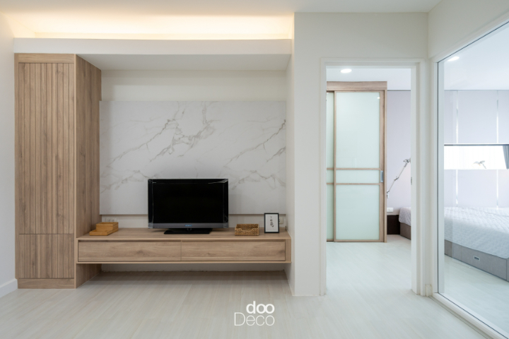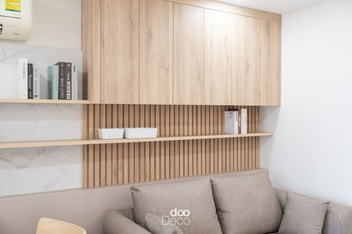 โซนห้องนั่งเล่นถูกออกแบบด้วยโทน สีขาวและสีไม้ ให้ความอบอุ่นแบบ Modern Minimal แต่แฝงความหรูหราด้วยการใช้ หินอ่อนบริเวณหลัง TV เพิ่มมิติให้พื้นที่ดูพรีเมียมขึ้นอย่างเป็นธรรมชาติ