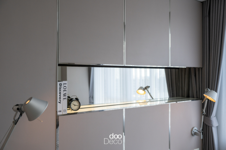 หัวเตียงถูกตกแต่งด้วย กระจกดีไซน์ Modern ที่ช่วยขยายมุมมอง ทำให้ห้องดูกว้างขึ้น พร้อมเสริมลูกเล่นด้านแสงและเงาให้สเปซมีมิติที่น่าสนใจ นอกจากนี้ยังสามารถใช้เป็นพื้นที่วางของเล็ก ๆ ได้ เพิ่มฟังก์ชันโดยไม่ลดทอนความสวยงาม