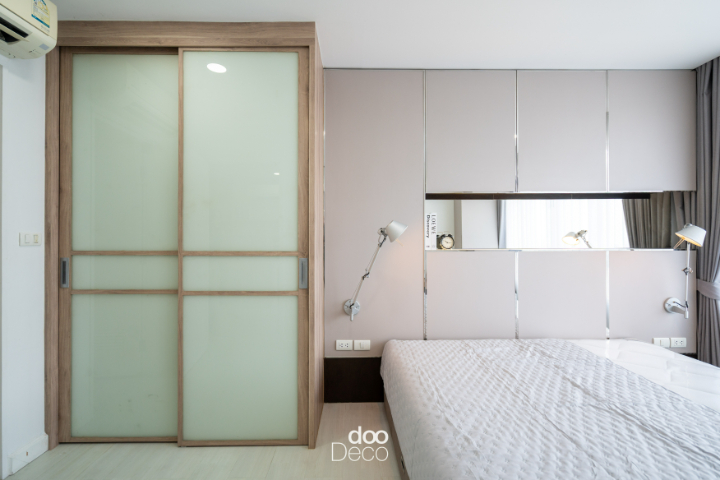 บริเวณโซนแต่งตัวในห้องนอนมีการออกแบบตู้ บิ้วอิน ฟิตอินแบบตู้สูงจรดฝ้า เพื่อเพิ่มพื้นที่เก็บของให้มากที่สุด ช่วยจัดเก็บเสื้อผ้าและของใช้ได้อย่างเป็นระเบียบ ทำให้ห้องดูเรียบร้อยและไม่รู้สึกรกตา เหมาะกับการใช้ชีวิตประจำวันในเมืองใหญ่ที่ทุกพื้นที่ต้อง "คุ้มค่า" ที่สุด
