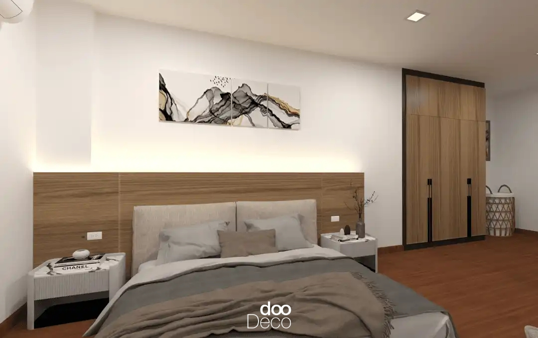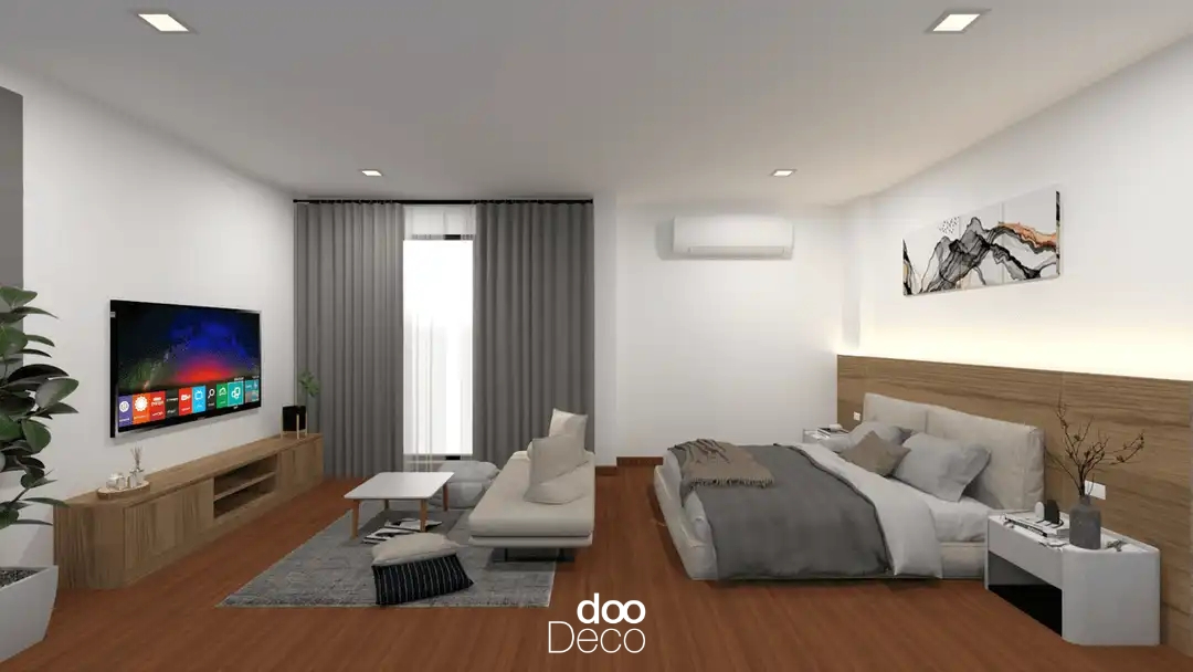 แสนอบอุ่นด้วยเฟอร์นิเจอร์และพื้นไม้ พร้อมโซฟาและเตียงวางพื้นสีเทา