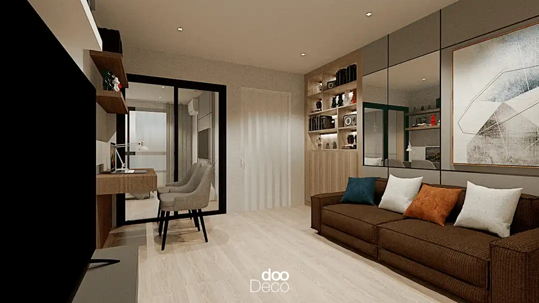 ลงตัวกับโต๊ะทำงานบิ้วอินสีไม้สุดเท่ พร้อมชั้นวางเหนือศีรษะ