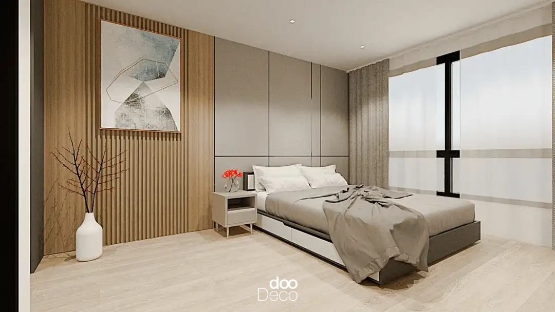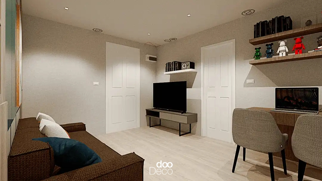 เรียบง่ายมีพื้นที่โปร่งสบาย พร้อมระแนงไม้แสนอบอุ่น ติดภาพกราฟฟิคที่ผนัง