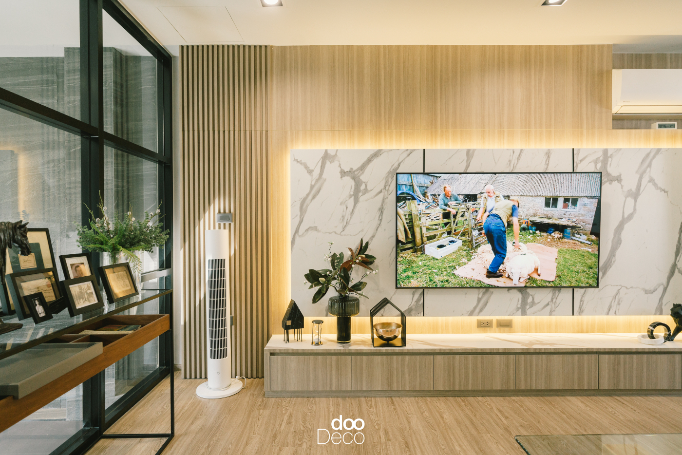 ด้วยมุมทีวีที่ออกแบบผนังด้วยไม้จริงสุดธรรมชาติ พร้อมซับอักชั้นด้วยลายหินอ่อนสุดหรูหราดูสะอาดตาแต่ก็ซ่อนลูกเล่นอย่างน่าสนใจ