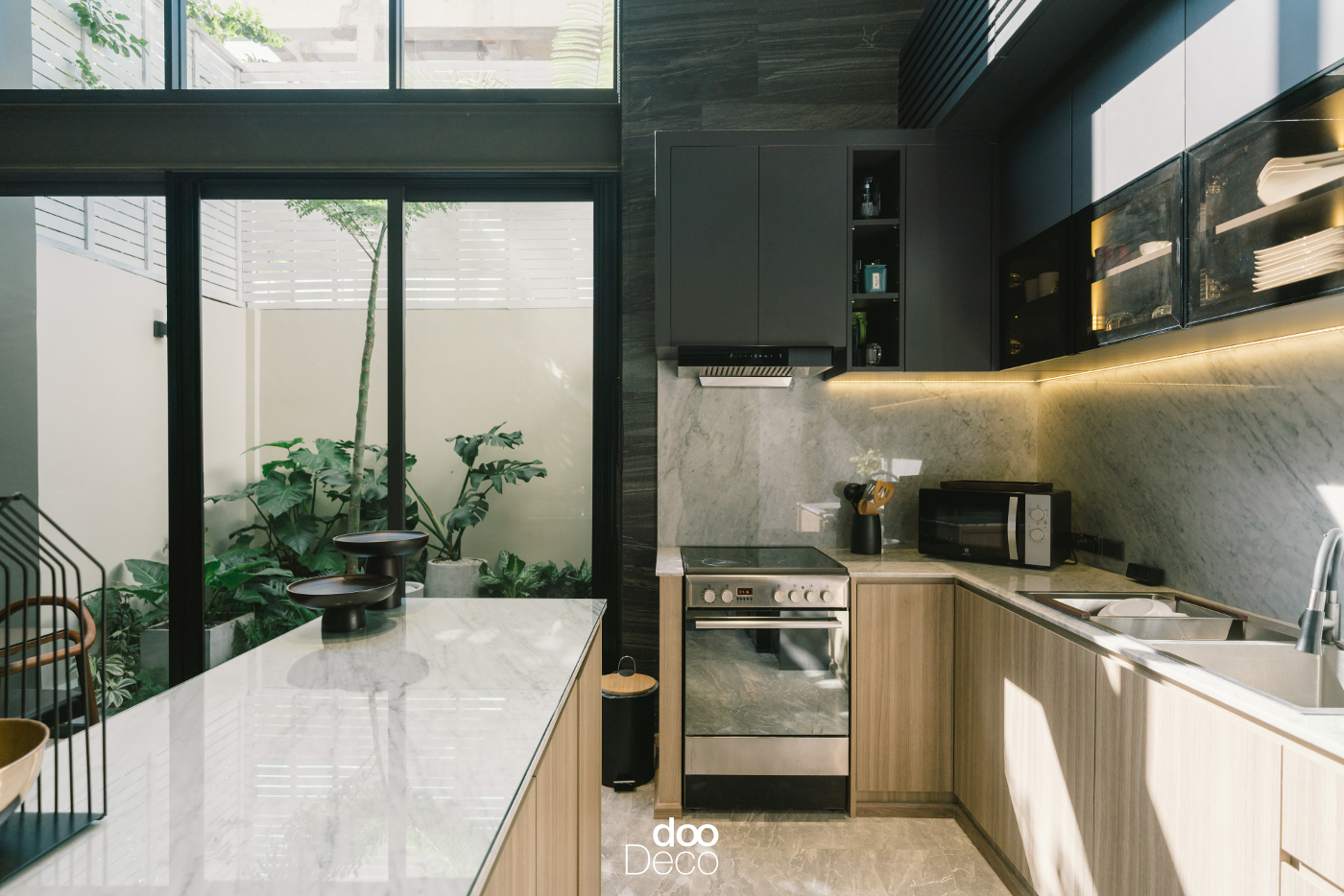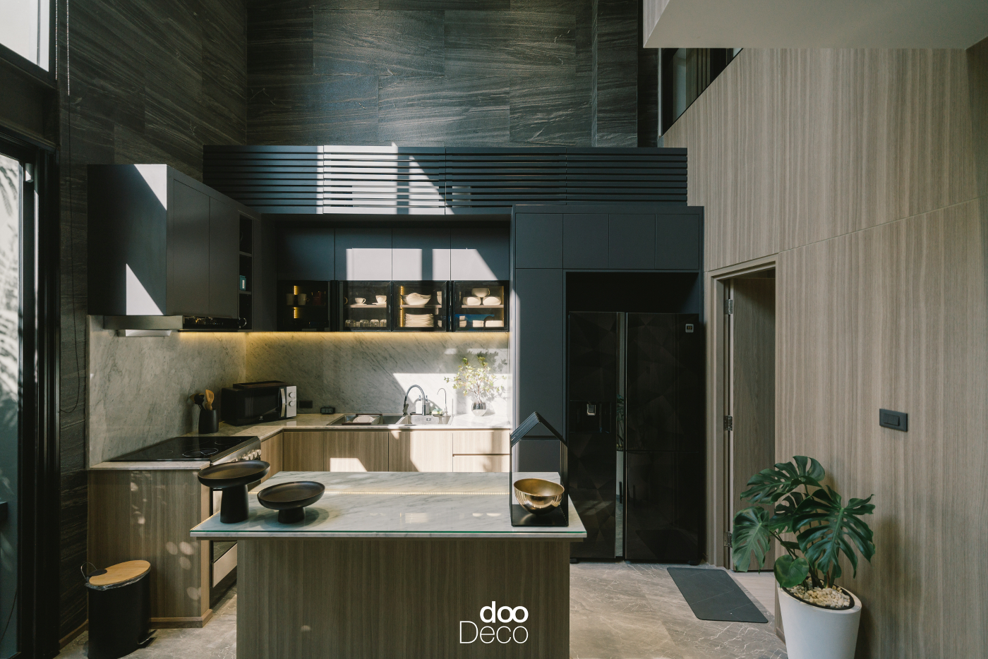 ไม่ว่าจะเป็นเคาท์เตอร์ปรุงอาหาร แพนทรีจัดเตรียมอาหาร โดยโทนห้องครัวที่เข้ม ขรึมช่วยเพิ่มอารมณ์