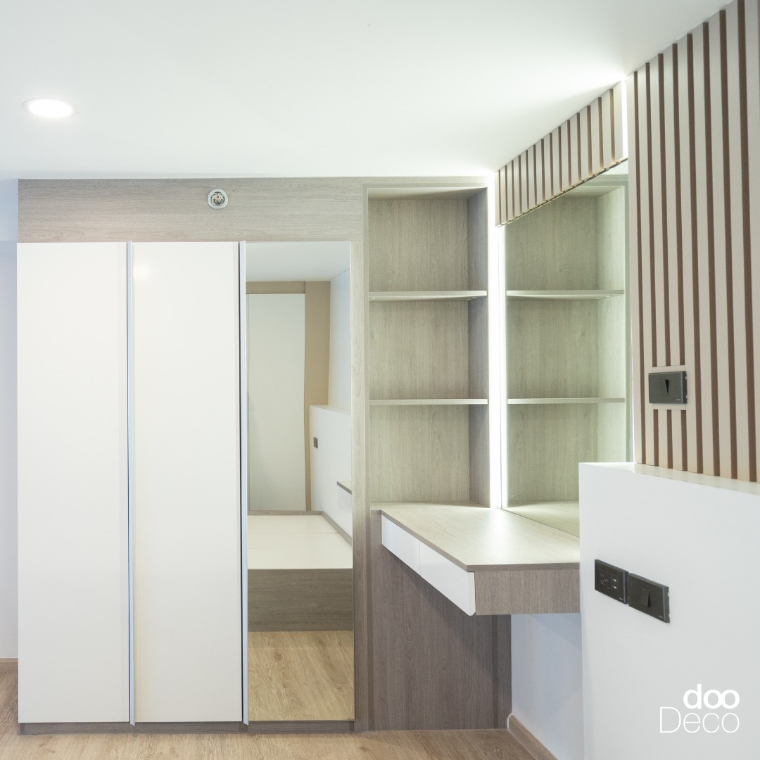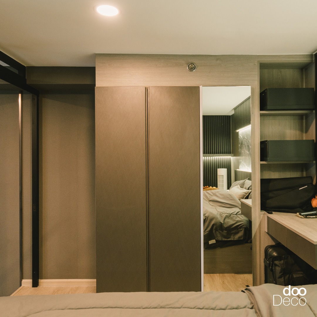 บิ้วอิน-ฟิตอินตู้เสื้อผ้าโทนสีน้ำตาลเข้ม พร้อมติดบานกระจกเต็มตัว สะท้อนให้ห้องนอนขนาดเล็กดูกว้างขวาง มีมิติขึ้น เชื่อมต่อกับชั้นอเนกประสงค์ที่สามารถวางกล่องเก็บของได้อย่างเป็นระเบียบ จัดเต็มฟังก์ชันครบในพื้นที่จำกัด