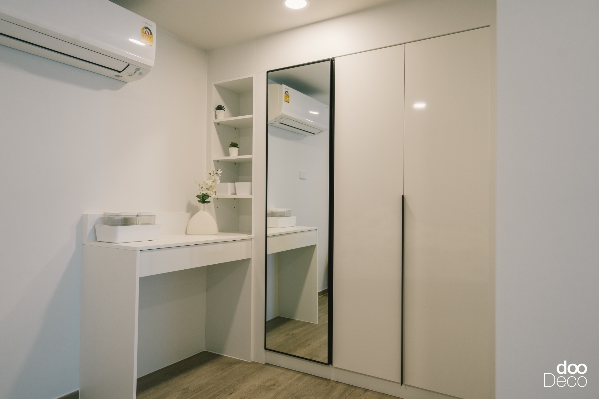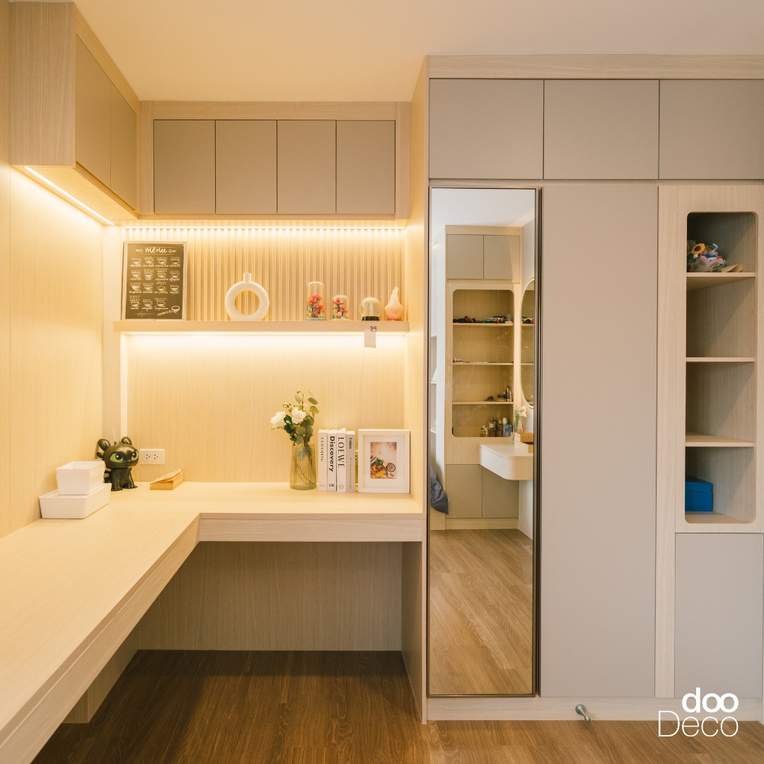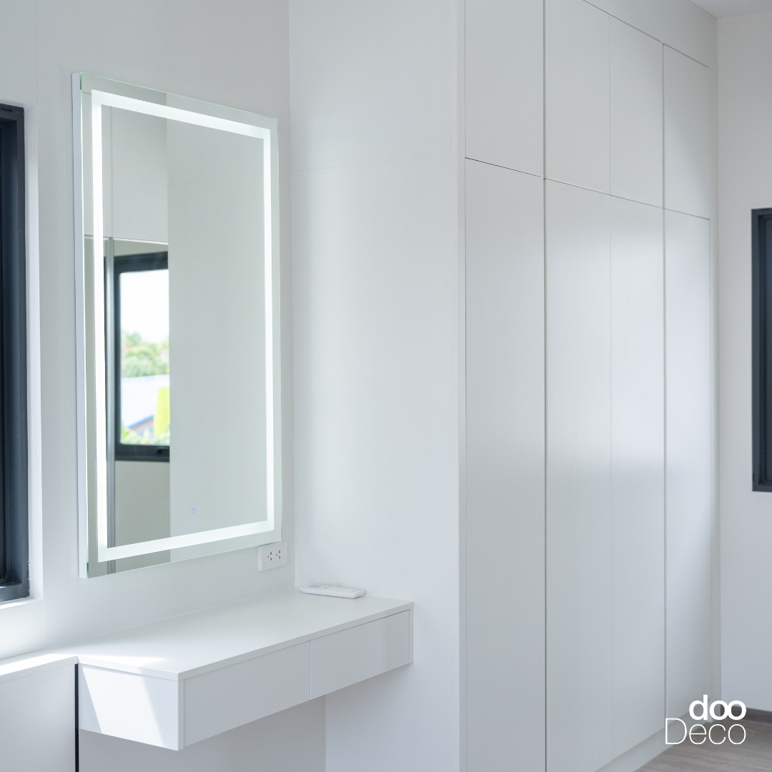 บิ้วอิน-ฟิตอินตู้เสื้อผ้าสีขาวสะอาด ติดตั้งเต็มผนังเพื่อความเป็นระเบียบ เสริมโต๊ะเครื่องแป้งแบบลอยตัวและกระจกกรอบไฟ LED ช่วยเพิ่มแสงสว่างขณะใช้งาน เปลี่ยน Mood ให้ภาพรวมดูสะอาด โปร่ง และเรียบร้อย