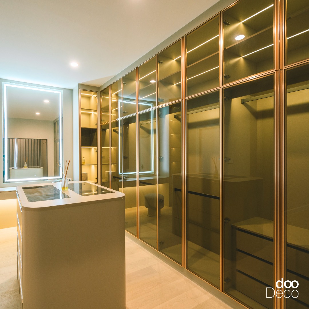 บิ้วอิน-ฟิตอินตู้เสื้อผ้าบานกระจกชาสีเข้ม เพิ่มกิมมิกความหรูโดยการตัดกรอบสีทอง ภายในติดตั้งไฟ LED ซ่อนตามชั้นและราวแขวน จัดวางคู่กับไอส์แลนด์กลางห้อง สำหรับใส่เครื่องประดับเพิ่มเติม เสริมให้ห้องแต่งตัวฟังก์ชันครบมากขึ้น