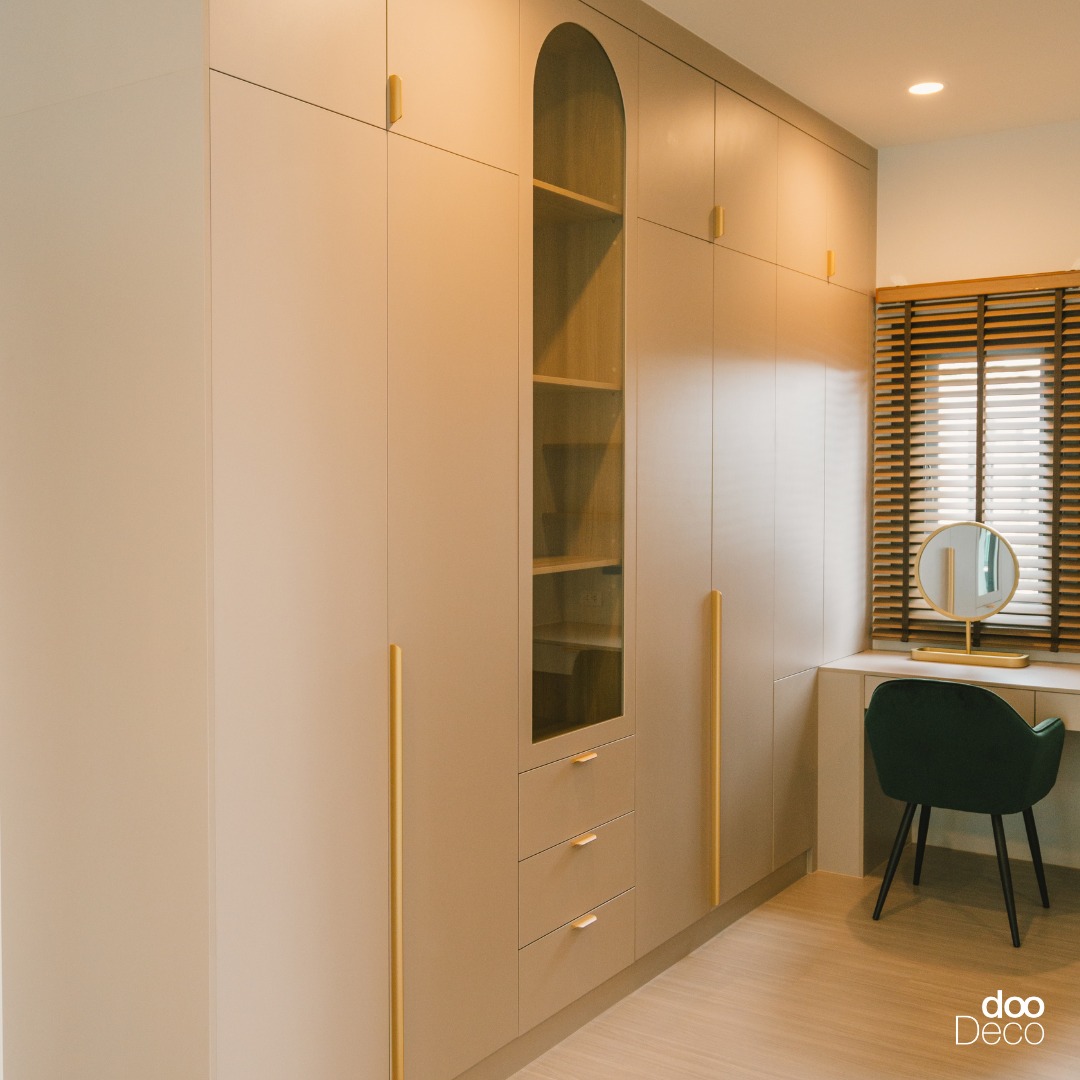 ตู้เสื้อผ้าโทนสีเบจ ดีไซน์เรียบหรู บิ้วอิน-ฟิตอินเต็มพื้นที่ผนัง เพิ่มจุดเด่นด้วยมือจับทรงยาวสีทอง ดูมินิมอลแต่มีดีเทล เติมช่องโชว์ซุ้มโค้งตรงกลาง สำหรับวางของตกแต่งหรือกระเป๋าใบโปรด และลิ้นชักด้านล่างสำหรับเก็บของชิ้นเล็กอย่างเป็นสัดส่วน