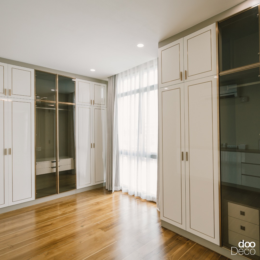 ออกแบบตู้เสื้อผ้าบิ้วอิน-ฟิตอินโทนสีขาว ตกแต่งหน้าบานแบบมีกรอบสไตล์คลาสสิก ตัดสลับกับบานกระจกกรอบสีทองเพิ่มความหรูหรา ช่วยเพิ่มมิติและสะท้อนแสงธรรมชาติจากหน้าต่าง ภายในมีทั้งราวแขวนและลิ้นชักเก็บของ เหมาะกับคนที่ชอบความเรียบหรูแบบอบอุ่น