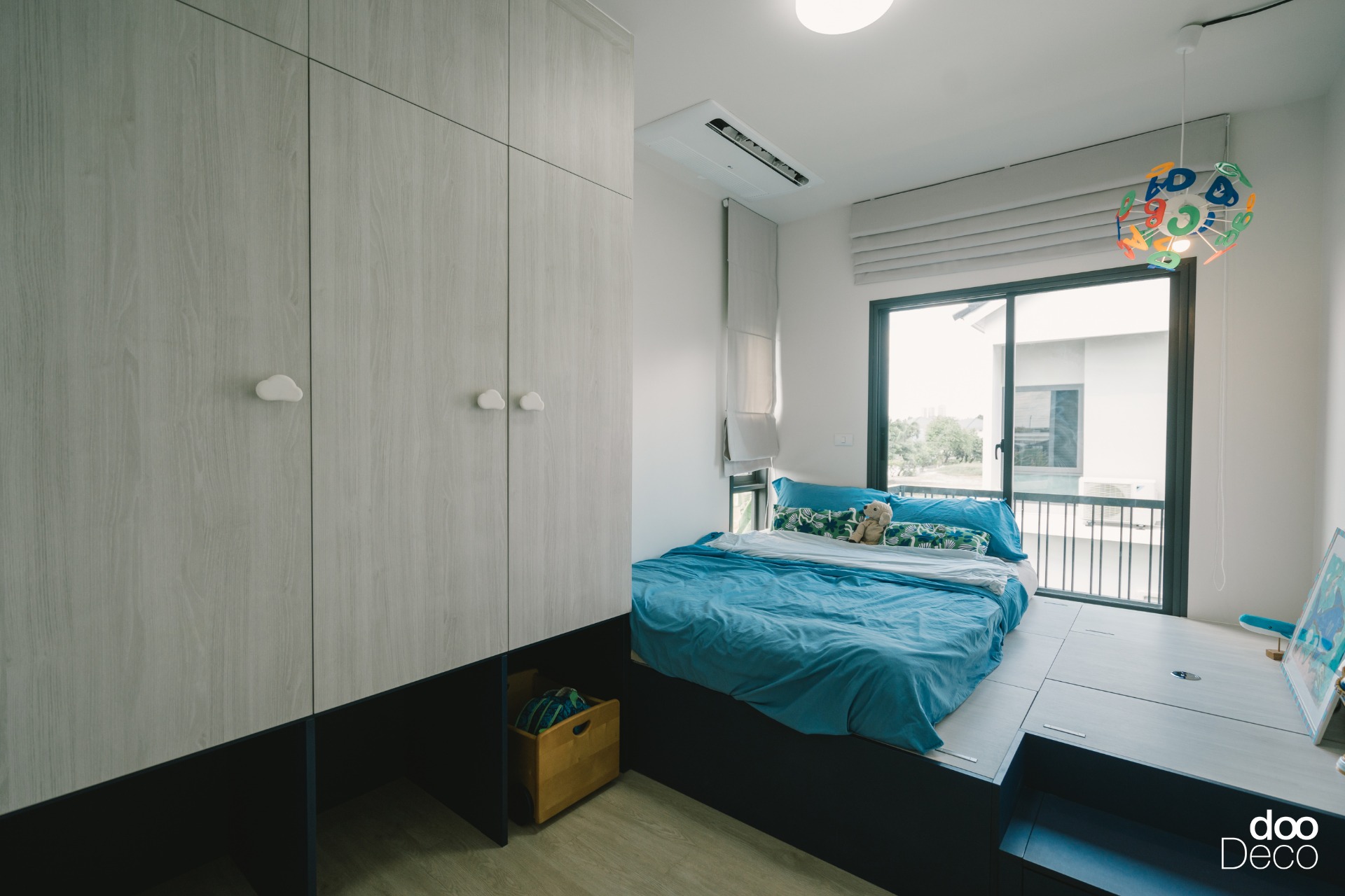 บิ้วอิน-ฟิตอินตู้เสื้อผ้าห้องนอนเด็กด้วยลายไม้สีอ่อน เพิ่มดีเทลมือจับลายก้อนเมฆ ด้านล่างเว้นช่องโล่งสำหรับเก็บกล่องหรือของชิ้นใหญ่ แมตช์กับเตียงยกระดับที่มีฟังก์ชันลิ้นชักใต้เตียง สำหรับเก็บของใช้ ของเล่นเจ้าตัวน้อยได้อย่างเป็นระเบียบ