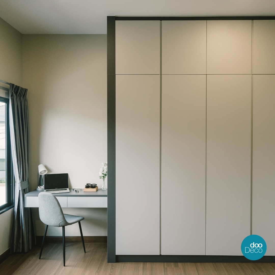 จัดเต็มตู้เสื้อผ้าบิ้วอิน-ฟิตอินบานเรียบสีขาวขนาดใหญ่ ตัดกรอบสีดำให้ดูมีมิติและเส้นสายชัดเจน เน้นให้พื้นที่ดูเป็นสัดส่วนมากขึ้น ด้านข้างเชื่อมต่อกับมุมลิ้นชักลอยตัว ที่จัดสรรเป็นโต๊ะทำงานขนาดกะทัดรัดได้อย่างพอดี