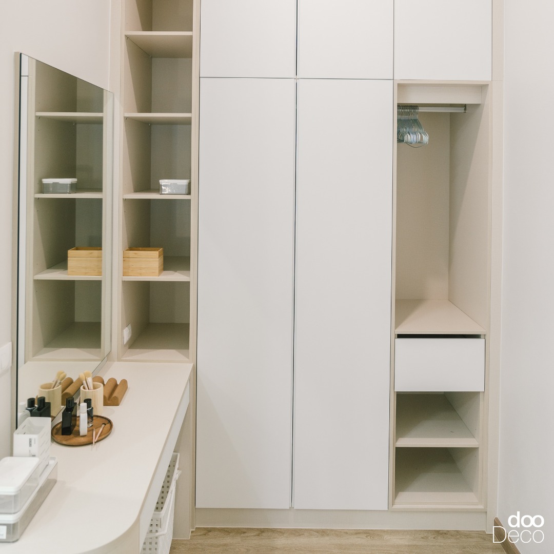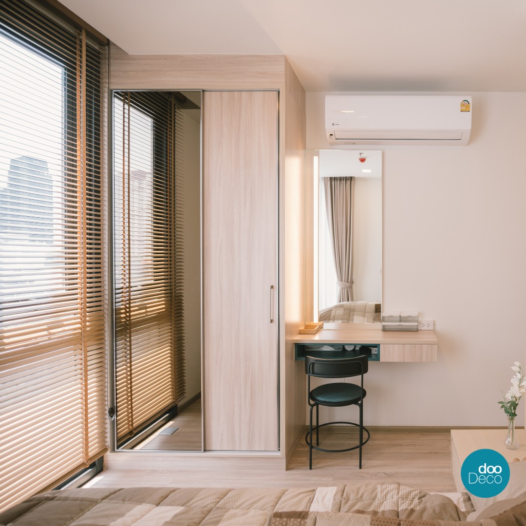บิ้วอิน-ฟิตอินตู้เสื้อผ้าบานเลื่อน เลือกวัสดุไม้โทนสีอ่อน พื้นผิวเรียบ คู่กับกระจกเงาเต็มบาน เพิ่มความโปร่งและใช้ตรวจเช็กความเรียบร้อยระหว่างแต่งตัว มาพร้อมโต๊ะเครื่องแป้งลอยตัว และติดม่านมู่ลี่ สร้างความ Cozy ให้กับห้องนอน