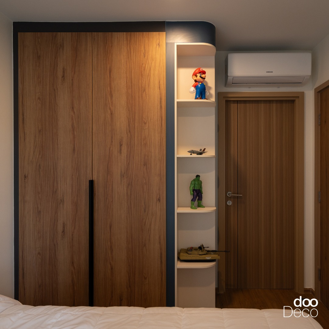 ออกแบบตู้เสื้อผ้าบิ้วอิน-ฟิตอินลายไม้ธรรมชาติโทนเข้ม ตัดขอบตู้ด้วยสีดำเท่ พร้อมมือจับแนวตั้ง ด้านข้างออกแบบเป็นชั้นโชว์ของมุมโค้งแบบเปิดโล่ง สำหรับวางของสะสมหรือของตกแต่งเล็ก ๆ ให้ดูมีลูกเล่นมากขึ้น เหมาะกับห้องที่อยากเพิ่มดีไซน์