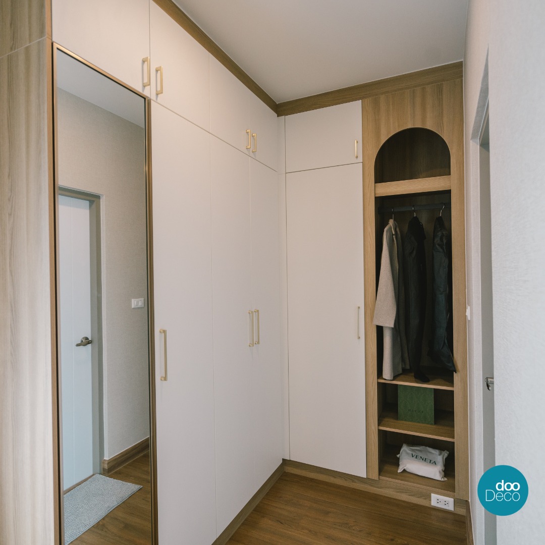บิ้วอิน-ฟิตอินตู้เสื้อผ้าที่ออกแบบเข้ามุม แม้พื้นที่เล็ก แต่ใช้พื้นที่ได้อย่างคุ้มค่า หน้าบานสีขาวตัดกับมือจับสีทองสวยหรู ด้านข้างเพิ่มช่องเปิดทรงโค้งมน สำหรับแขวนเสื้อผ้า ชุดสูท หรือจัดวางของใช้ประจำวัน ใช้งานสะดวกทุกมุม