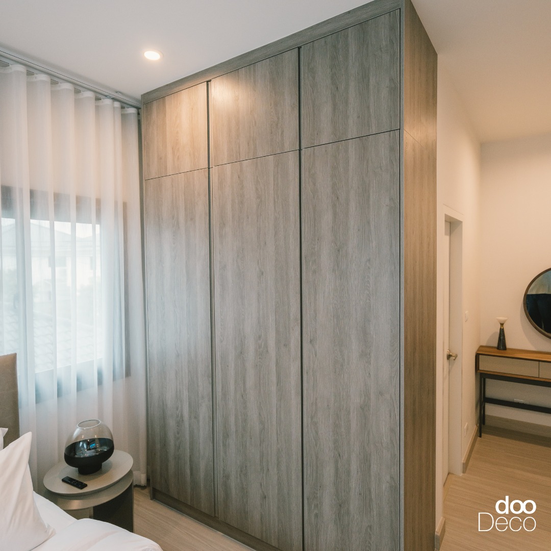 บิ้วอิน-ฟิตอินตู้เสื้อผ้าลายไม้โทนสีน้ำตาลแกมเทา ดีไซน์เต็มความสูงถึงเพดาน ช่วยเพิ่มพื้นที่เก็บของโดยไม่เปลืองพื้นที่ห้อง ออกแบบบานเรียบไร้มือจับดูคลีน สบายตา เหมาะกับห้องนอนที่ต้องการบรรยากาศเรียบง่ายและอบอุ่น