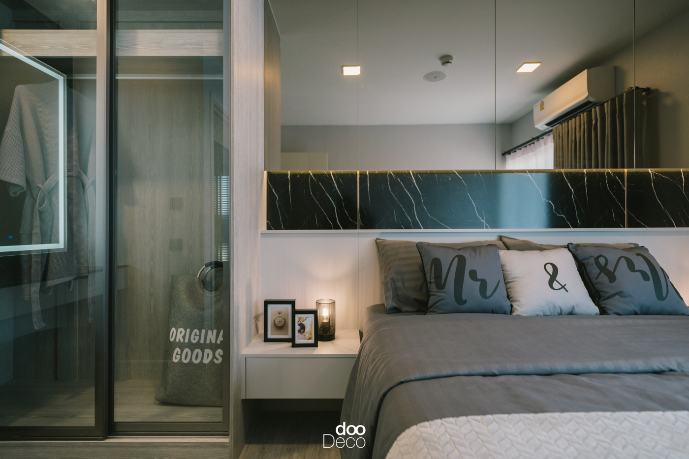 บิ้วอิน-ฟิตอินตู้เสื้อผ้าโทนไม้อบอุ่น ใช้บานเลื่อนแบบใส คุมโทนสีเทาและสีดำให้ลุคโมเดิร์น เข้ากับหัวเตียงลายหินอ่อนหรูอย่างลงตัว ภายในจัดราวแขวนและชั้นเก็บของด้านบน เหมาะกับห้องนอนคอนโดที่ต้องการทั้งความโปร่งและฟังก์ชันครบในพื้นที่จำกัด