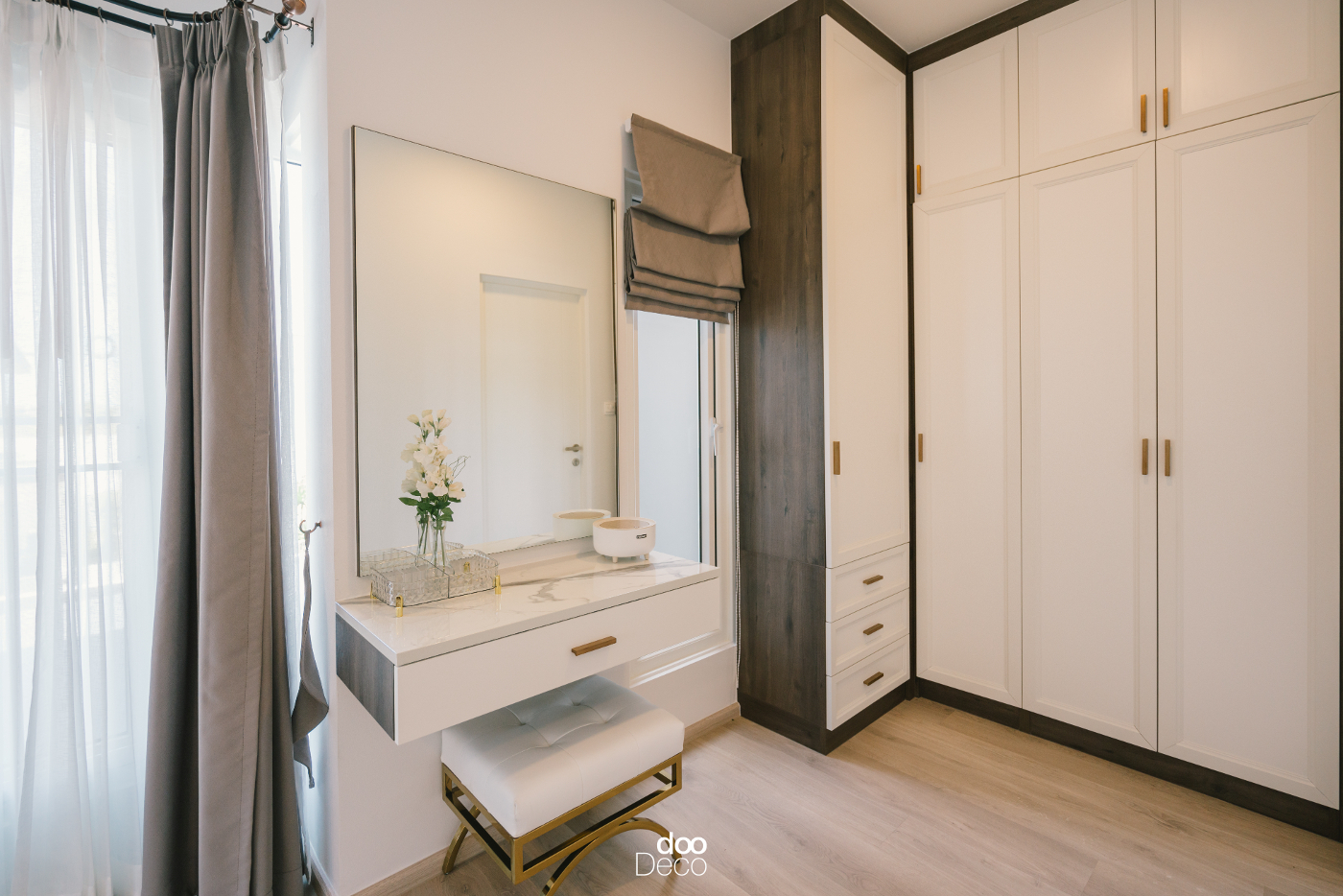 บิ้วอิน-ฟิตอินตู้เสื้อผ้าบานกระจกใส เสริมด้วยกรอบโลหะสีทองสุดพรีเมียม โชว์เสื้อผ้าและเครื่องประดับ กระเป๋าสวย ๆ ได้อย่างชัดเจน ภายในจัดราวแขวนและชั้นพับแยกสัดส่วน พร้อมโซนโต๊ะเครื่องแป้งสีขาวดีไซน์เรียบง่าย ซ่อนไฟ LED ทำให้มุมแต่งตัวดูโปร่งและใช้งานสะดวกสบาย