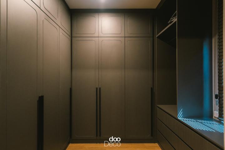 บิ้วอิน-ฟิตอินตู้เสื้อผ้าเต็มพื้นที่ผนังในโทนสีดำ บานประตูดีไซน์กรอบมนพร้อมมือจับทรงยาว เน้นเส้นสายชัดเจน พร้อมช่องเปิดด้านข้างและลิ้นชักด้านล่างสำหรับจัดเก็บของใช้ส่วนตัว ตอบโจทย์คนที่ชอบบรรยากาศเรียบเท่ โมเดิร์น ทันสมัย